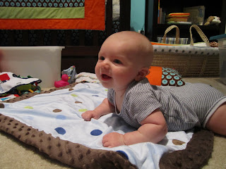 Here are some picture of Cameron! Lately, Cameron has been laughing a lot, grabbing his feet, staring at his hands and trying to "work" them on command, grabbing for toys, and teething! Cameron's first tooth appeared about a week ago. It is a sharp little thing! He also loves to try to talk to you and makes lots of funny noises. He's such a funny little guy!